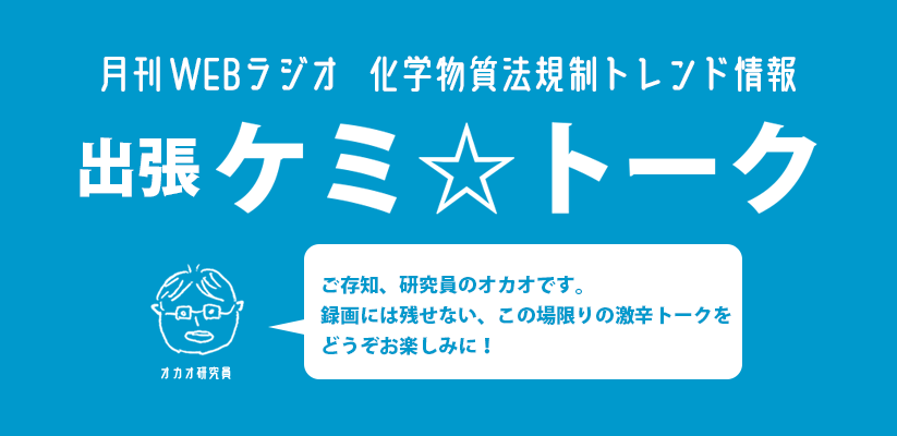 毎度おなじみWEBラジオ「ケミ☆トーク」、化学物質規制のトレンド情報を毎月配信しております。今回はケミマテ出張版ということで、いつものアーカイブには残せない、この場限りの辛口トークをお届けします。解説テーマは当日のお楽しみ。講演会場のすぐそば、弊社EnviXのブース〔南展示棟1ホールM-04〕にもお気軽にお立ち寄りください。